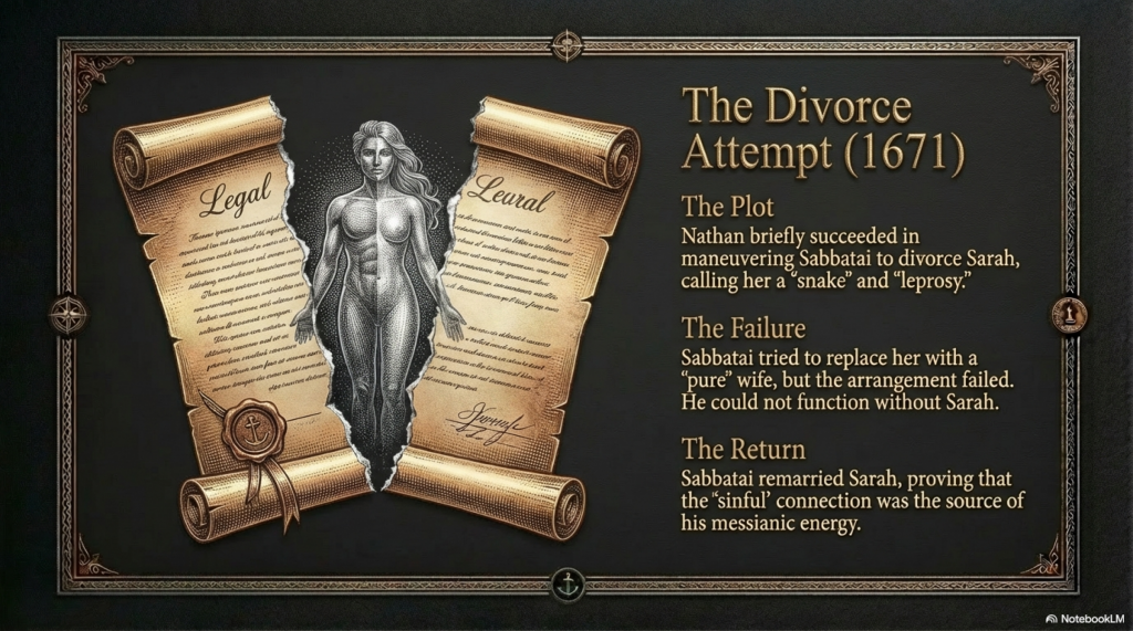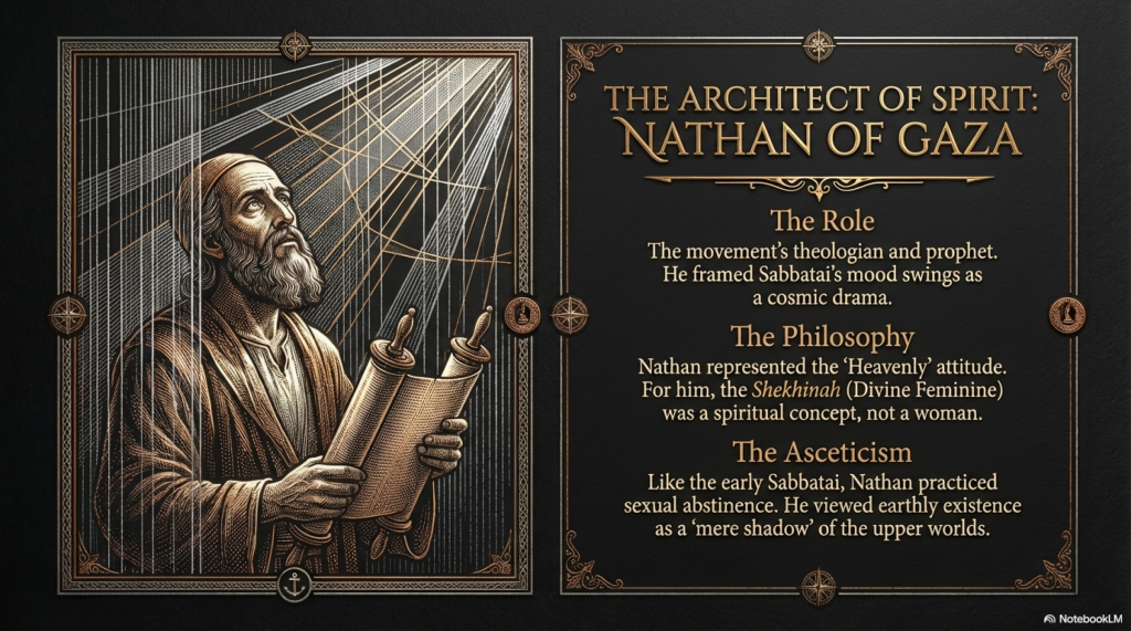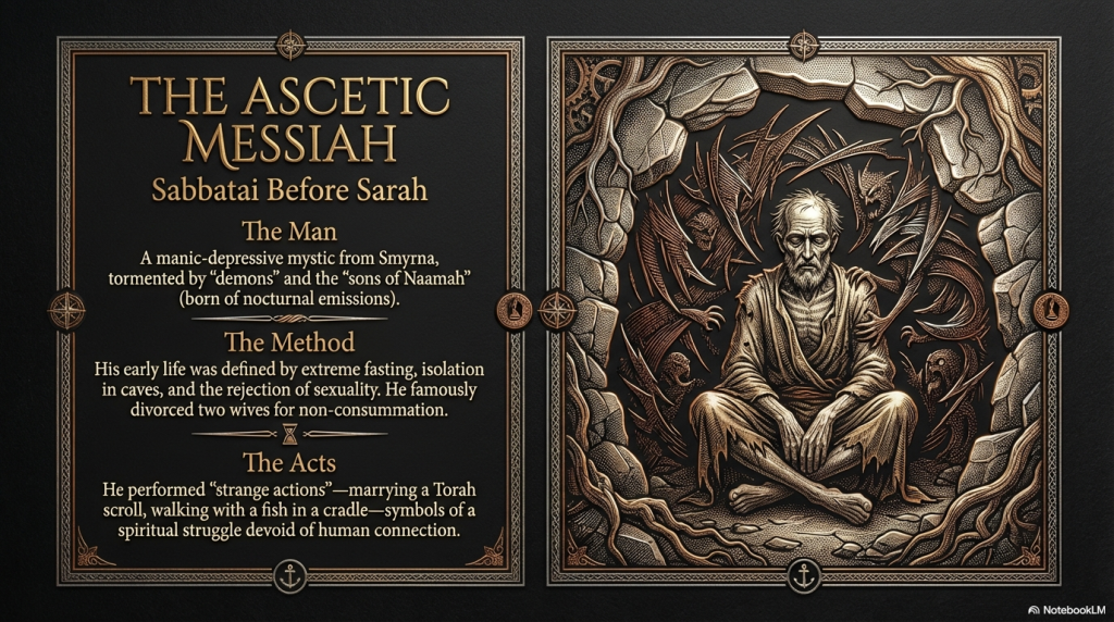 Before Sarah, Sabbatai Zevi’s messianism was defined by extreme asceticism. Tormented by “demons,” his early life was characterized by isolation in caves and the rejection of sexuality, famously divorcing two wives for non-consummation. Nathan of Gaza, the movement’s architect, reinforced this “Heavenly” attitude. To Nathan, the Shekhinah was a spiritual concept, and the earthly wife was merely a “lowly metaphor” for the divine.