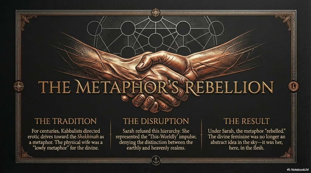 This is where the history becomes truly gripping for us. Alexander van der Haven argues that Sarah represented a radical shift in Jewish mysticism. Prior to this, Kabbalistic concepts like the union of the male and female aspects of the Divine were treated as metaphors. The mystic might visualize the Shekinah (the Divine Presence), but he would never equate her with a physical woman of flesh and blood.