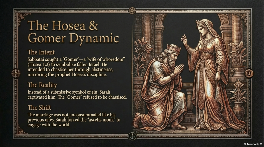 Why would a man known for asceticism marry a woman with a reputation for licentiousness? The sources suggest a theological motivation rooted in the Nevi’im (Prophets). Sabbatai Tsevi modeled this union on the Prophet Hosea (Hoshea), whom God commanded to marry a “wife of whoredom” (Gomer) to symbolize the relationship between God and a wayward Israel. By marrying Sarah, Sabbatai was performing a tikkun (repair), engaging with the “fallen” aspects of the world to redeem them.