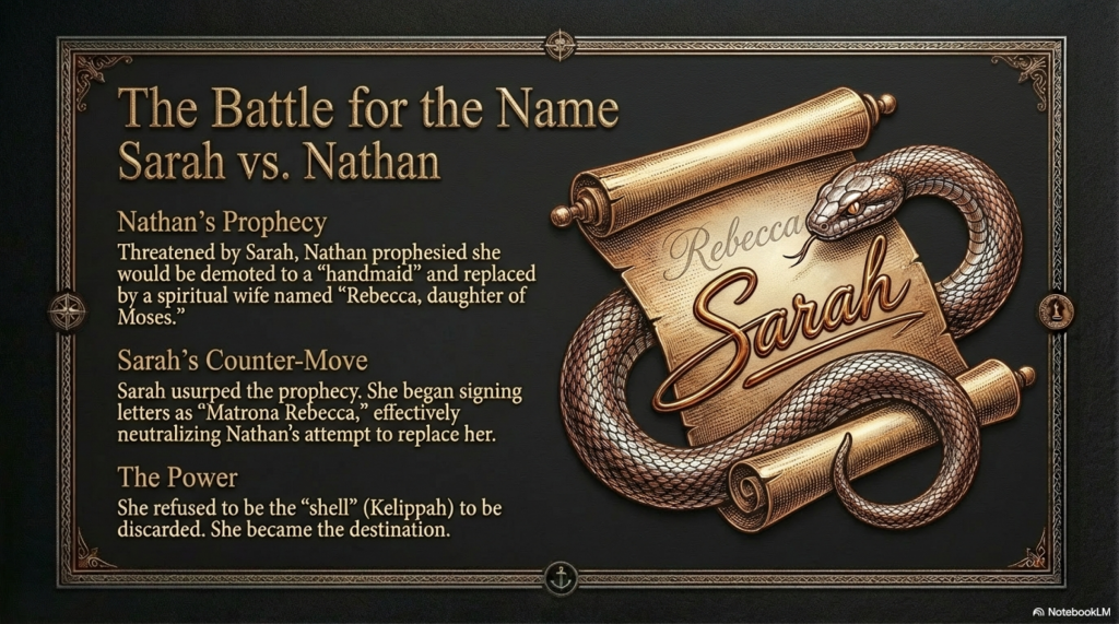 There was significant tension between Sarah and Nathan of Gaza. Nathan, who maintained a more ascetic and spiritual outlook, viewed Sarah as a liability or a necessary evil (the “Gomer” to be chastised). In a prophecy, Nathan predicted that after the redemption, Sarah (whom he referred to as a “handmaid” or concubine) would be replaced by a celestial queen named Rebecca, the daughter of Moses.