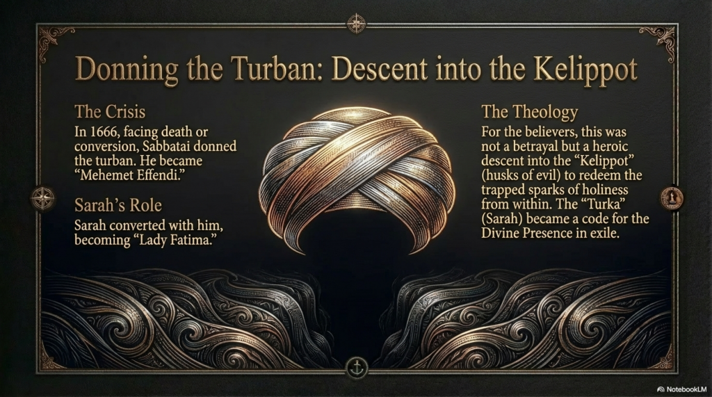 In 1666, the movement faced its greatest crisis when Sabbatai converted to Islam. Sarah converted with him, becoming “Lady Fatima”. For believers, this was not a betrayal but a heroic descent into the Kelippot (husks of evil) to redeem trapped sparks of holiness. Despite a brief attempt by Nathan to convince Sabbatai to divorce her in 1671—calling her a “snake” and “leprosy”—Sabbatai found he could not function without her. His return to Sarah proved that their “sinful” connection was, in fact, the source of his messianic energy.