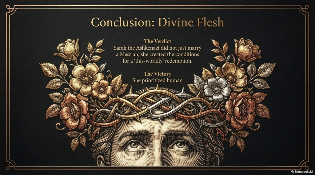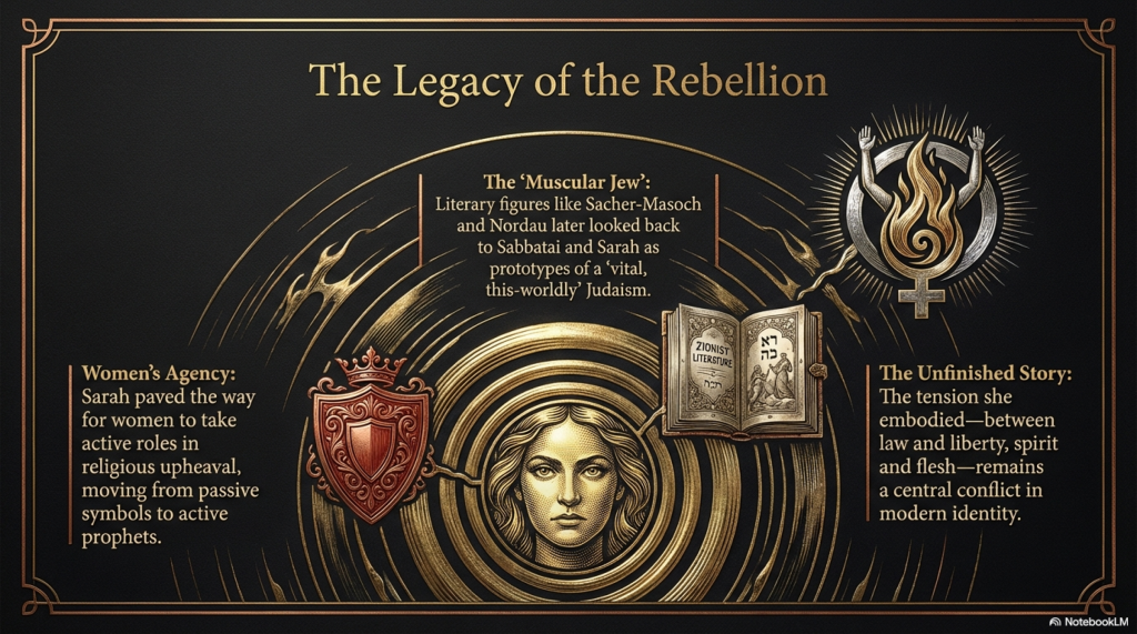 The union of Sabbatai and Sarah represented “Spousal Theosis”—the collapse of the metaphor into the flesh. They did not just point to the divine; they claimed to be the divine incarnation on earth. Sarah’s rebellion paved the way for women to move from passive symbols to active prophets in religious upheaval. Her legacy lives on in the “this-worldly” muscular Judaism later admired by early Zionist thinkers, embodying a permanent tension between law and liberty, and spirit and flesh.