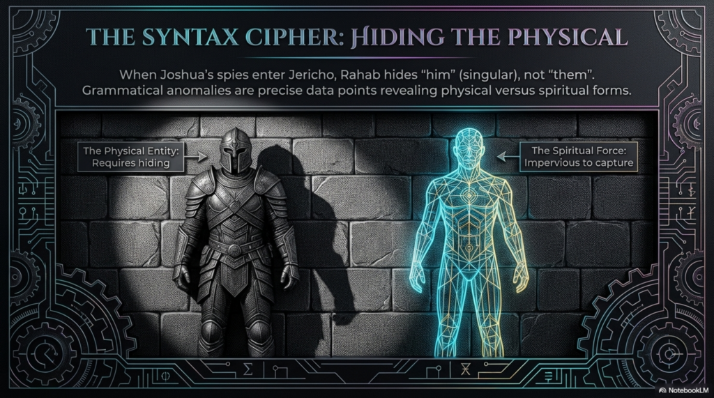 A quintessential example of this “smoking gun” methodology is found in Joshua 2. When the spies—identified by tradition as Caleb and Phinehas—arrive in Jericho, Rahab hides them. However, the Hebrew text employs a startling singular suffix: vatitzpeno (“she hid him“) rather than the expected plural vatitzpenem (“she hid them“).