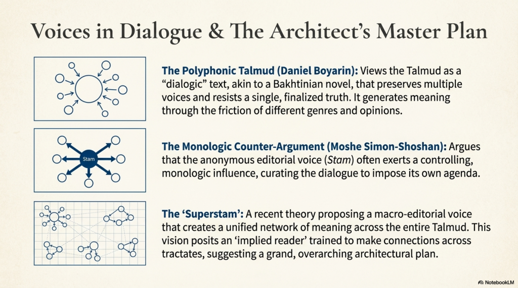 However, this application of Bakhtin is not without its critics. Moshe Simon-Shoshan argues that while the Talmud appears polyphonic, the anonymous editorial voice (the Stam) often exerts a controlling, monologic influence.3 The Stam aggressively reinterprets earlier voices to suit its own agenda, suggesting that the “dialogue” is often a carefully curated literary construct rather than a free exchange of ideas. The Stam does not merely record the debate; it creates the debate, often fabricating dialogue between sages who lived centuries apart to serve a pedagogical or theoretical point.3