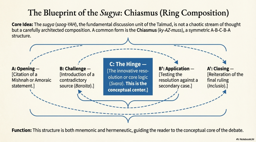 One of the most prevalent literary devices in the sugya is chiasmus (or ring composition). Chiasmus is a symmetric structure (A-B-B-A or A-B-C-B-A) used to emphasize the central element or to create a sense of closure.14 This structure is not unique to the Talmud; it is found in Biblical poetry and ancient epics like the Iliad, but the Talmud adapts it for legal dialectic.16