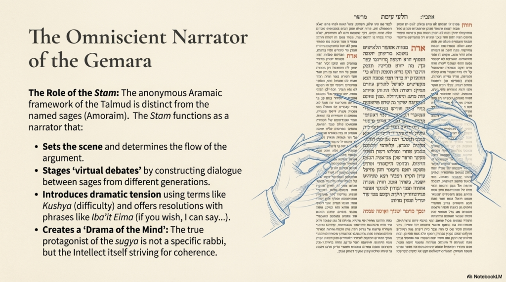 This narrative voice is distinct from the named sages. While the Amoraim speak in brief, often apodictic rulings, the Stam speaks in a discursive, questioning, Aramaic dialect. The result is that the sugya functions as a “drama of the mind,” where the protagonist is not a specific rabbi, but the Intellect itself, struggling to reconcile contradictions and achieve coherence.19