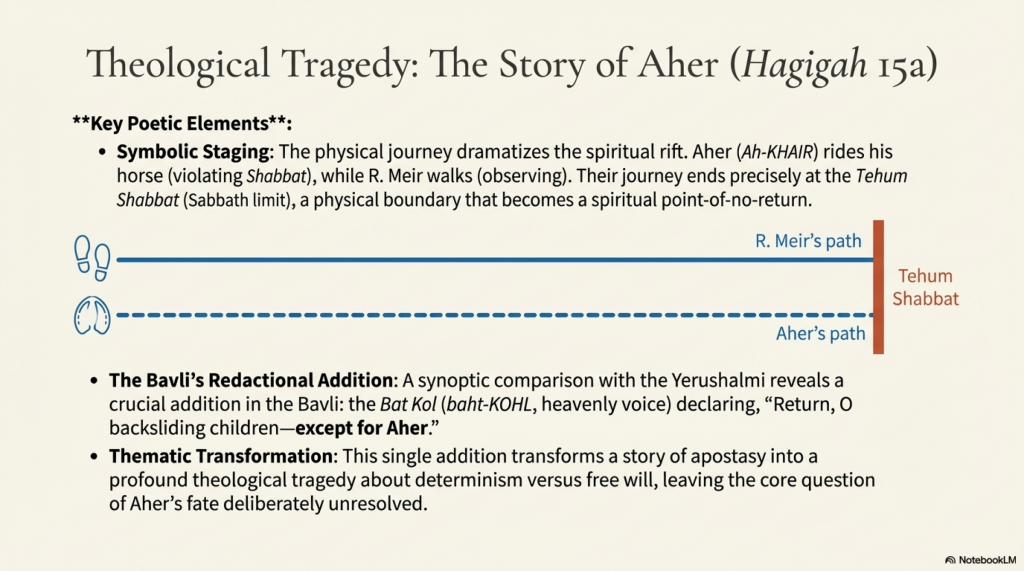 - Intertextuality and Redaction: Rubenstein notes that the Bavli’s version is significantly expanded from the Yerushalmi’s. The Bavli adds the motif of the “heavenly voice” (Bat Kol) declaring “Return o backsliding children—except for Aher”.7 This addition transforms a story about simple apostasy into a theological tragedy about determinism. Is Aher’s refusal to repent an act of free will, or is he cosmically rejected? The Stam leaves this ambiguity unresolved, creating a “tragic” mode rare in earlier Rabbinic literature.