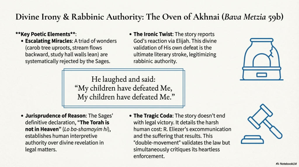 - Divine Irony and Anthropomorphism: The story culminates in Elijah the Prophet reporting that God “laughed and said: My children have defeated Me.” This anthropomorphic depiction of God validating His own defeat is a supreme literary stroke. It legitimizes human interpretative authority through the very divine voice it claims to ignore.23