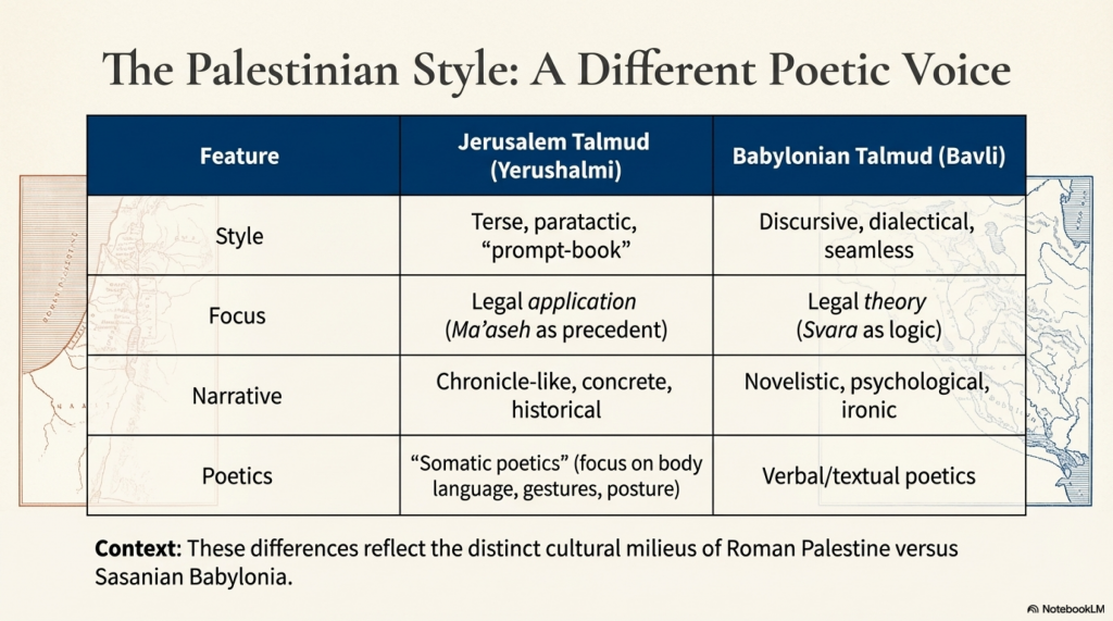 The divergence between the Bavli and Yerushalmi highlights two distinct literary cultures: the Bavli’s dialectical, novelistic, and highly redacted style versus the Yerushalmi’s terse, anthological, and precedent-focused style. This reflects the different cultural milieus of Sasanian Babylonia, with its emphasis on academic abstraction, versus Roman Palestine, with its emphasis on tradition and case law.5