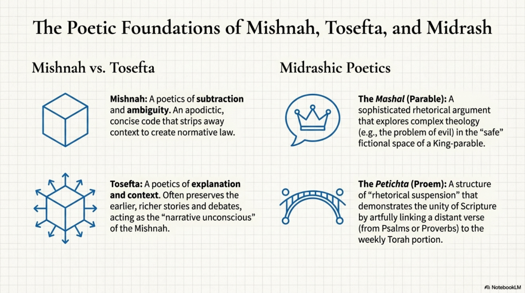 The Tosefta and Midrash further expand this poetic universe, offering alternative modes of legal and theological expression. The Mashal allows for theological daring through fiction, while the Tosefta preserves the narrative context that the Mishnah suppresses.