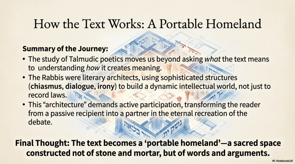 Ultimately, the study of Talmudic poetics moves beyond the question of “what the text means” (exegesis) or “what happened” (history) to the question of “how the text works” (poetics). It uncovers the mechanisms by which the Rabbinic sages transformed oral debate into a timeless textual “home.” By utilizing structures like chiasmus, ring composition, and the dialogic sugya, the Rabbis created a text that demands active participation from its reader—a “pedagogy of reading” that ensures the continuity of the tradition not just through obedience to the law, but through the eternal recreation of the debate.12