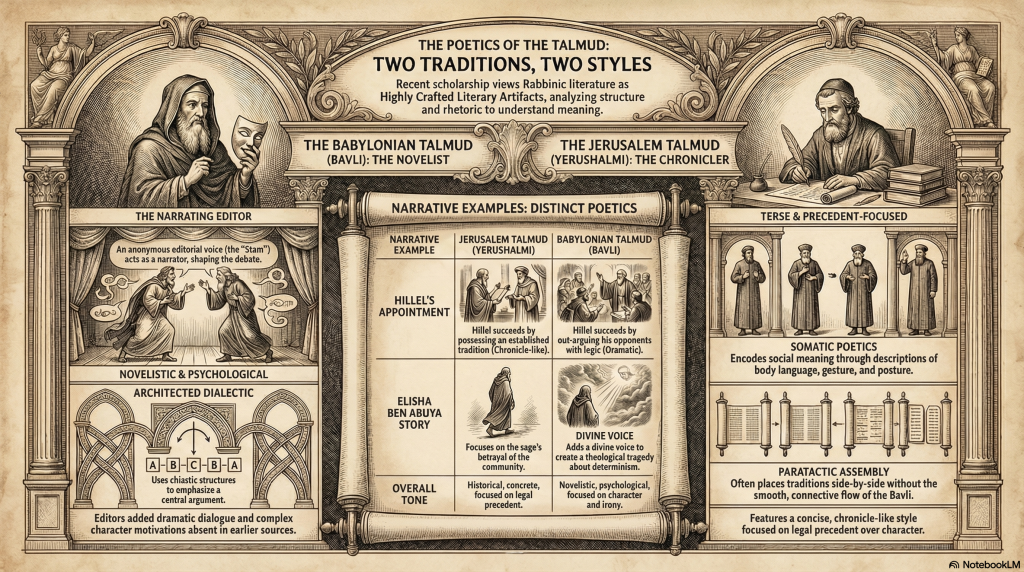 However, the late 20th and early 21st centuries witnessed a “literary turn” in Rabbinic studies. Scholars began to recognize that these texts are not mere stenographic transcripts of academy debates or uncurated collections of folklore. Rather, they are highly constructed, sophisticated literary artifacts.1 This shift, often termed “Talmudic Poetics,” posits that the redactors (Stammaim) and compilers were active literary artists who employed specific rhetorical devices, narrative structures, and intertextual strategies to generate meaning.