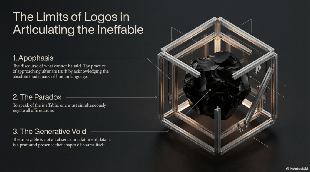 In a hyper-connected, relentlessly noisy world, the apophatic tradition offers a necessary sanctuary. It reminds us that embracing the mystery of existence isn’t a failure of intelligence; it is intelligence reaching its highest form. When we stop trying to fill every silence with an explanation, we allow the world to speak to us in its own, unutterable language.If we are always talking, we are only repeating what we already know. It is only in the empty space that something truly new—something innocent and transformative—can emerge.”Whereof one cannot speak, thereof one must be silent.” — Ludwig Wittgenstein (Vol 2, Ch 13)If the most important truths cannot be spoken, what are we currently drowning out with our noise?