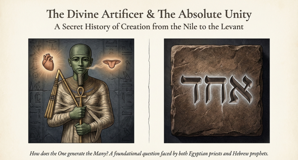 The inquiry posits that Ptah and Echad represent two distinct yet cognate responses to the discovery of the Logos—the realization that the universe is not merely a biological secretion of the gods, but an intellectual artifact spoken into existence by a supreme consciousness. Through a rigorous philological and comparative analysis, this report demonstrates that the “One” of Memphis and the “One” of Jerusalem share a common mechanism of creation—the synthesis of Thought (Heart/Wisdom) and Speech (Tongue/Word)—while diverging on the relationship between that Creator and his Creation.