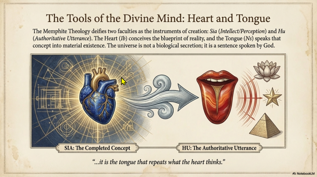 The “secret” mechanism of Ptah’s creative power is the synergy of two faculties: the Heart (Ib) and the Tongue (Ns). In Ancient Egyptian anthropology, the heart was the seat of the mind, the center of consciousness, memory, and intentional thought. The tongue was the agent of authoritative utterance and command.