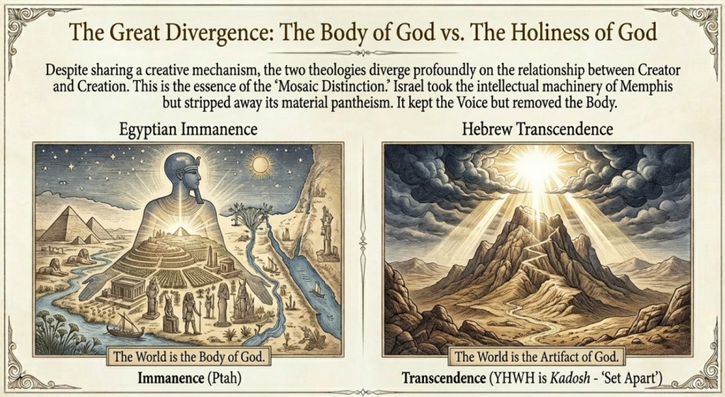 The “Secret” of the Hebrew innovation is that it took the intellectual mechanism of Memphis (Creation by Word) but stripped away the material ontology (Pantheism). It kept the Voice but removed the Body.