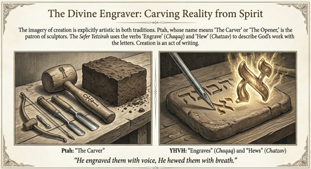 - The Secret of the Engraving: Both the Sefer Yetzirah and the iconography of Ptah view creation as an act of artistic “carving”—imposing form upon the formless void (Nun / Tohu).