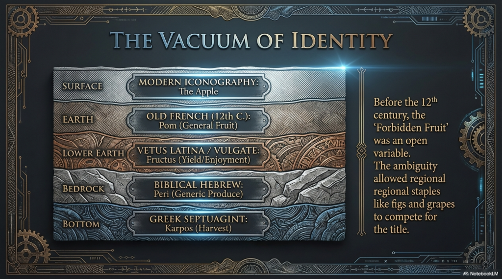 The following table outlines the linguistic variations in the term for “fruit” across primary ancient translations, illustrating the early lack of botanical specificity.