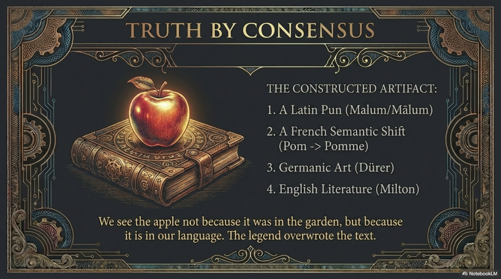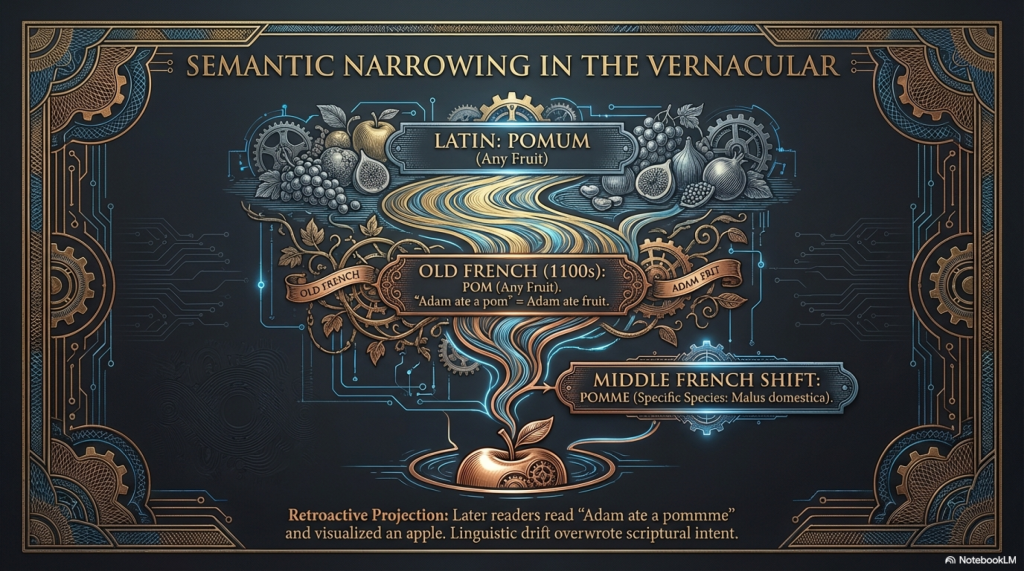 - Projective Reinterpretation (Post-1200s): Readers of the vernacular Bible understand “Adam ate a pom” as “Adam ate an apple.” Artists in 12th-century France begin representing the scene with apples, a practice that eventually supplants depictions of grapes and figs.14