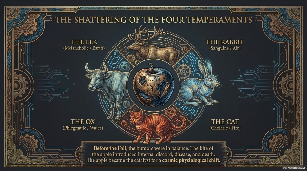 Dürer’s engraving was not merely a literal representation of the Fall but a dense collection of medieval and Renaissance symbolism. Placed around Adam and Eve are four animals, each representing one of the “four temperaments” or humors that were believed to govern human health and personality: