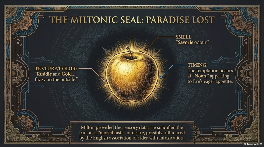 If Dürer provided the visual template for the apple, the English poet John Milton provided the definitive literary one. In his 1667 epic Paradise Lost, Milton explicitly identifies the forbidden fruit as an apple twice.8 Milton, a polyglot scholar who was undoubtedly aware of the linguistic ambiguity of the Hebrew and Latin texts, likely chose the apple for its rich sensory and symbolic potential.9