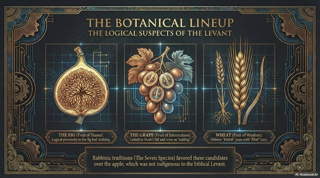 While the Western tradition coalesced around the apple, Jewish tradition and early Christian commentators proposed a wide variety of candidates for the forbidden fruit, based on botanical proximity, linguistic puns, and symbolic associations.1