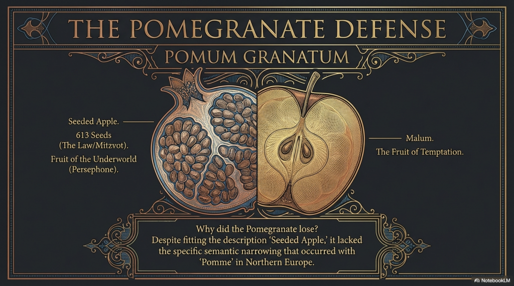 | Linguistic Link | Pomum granatum (seeded apple) | Malum/Mālum (evil/apple) |
