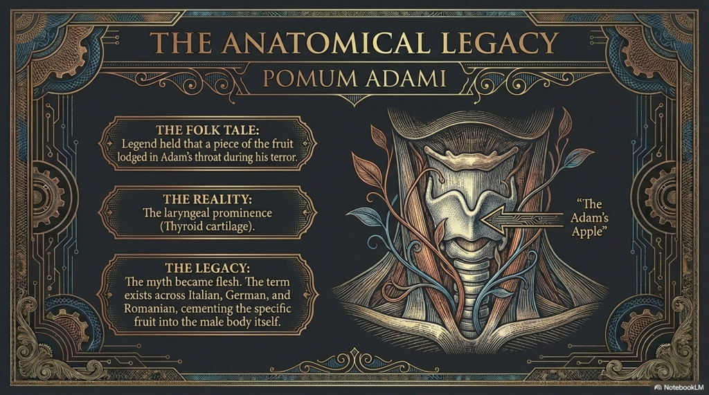 Scientifically, the Adam’s apple is the thyroid cartilage, which protects the larynx and vocal cords.16 Its growth is stimulated by testosterone during puberty, hence its greater prominence in males.16 The transition from the medical term “thyroid cartilage” to the colloquial “Adam’s apple” across numerous languages—pomo d’Adamo (Italian), Adamsapfel (German), mărul lui Adam (Romanian)—reflects the pervasive power of the Eden narrative to shape how humans perceive their own physical bodies.13