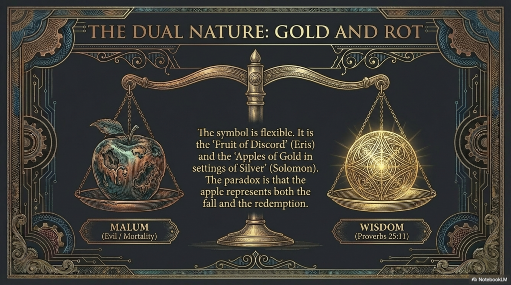 This linguistic duality—where the “apple” is both the instrument of the Fall and a metaphor for the highest wisdom and divine protection—highlights the complexity of the symbol. The “apple of knowledge” became evil through disobedience, but the “apple of gold” remains a symbol of fitly spoken truth.12