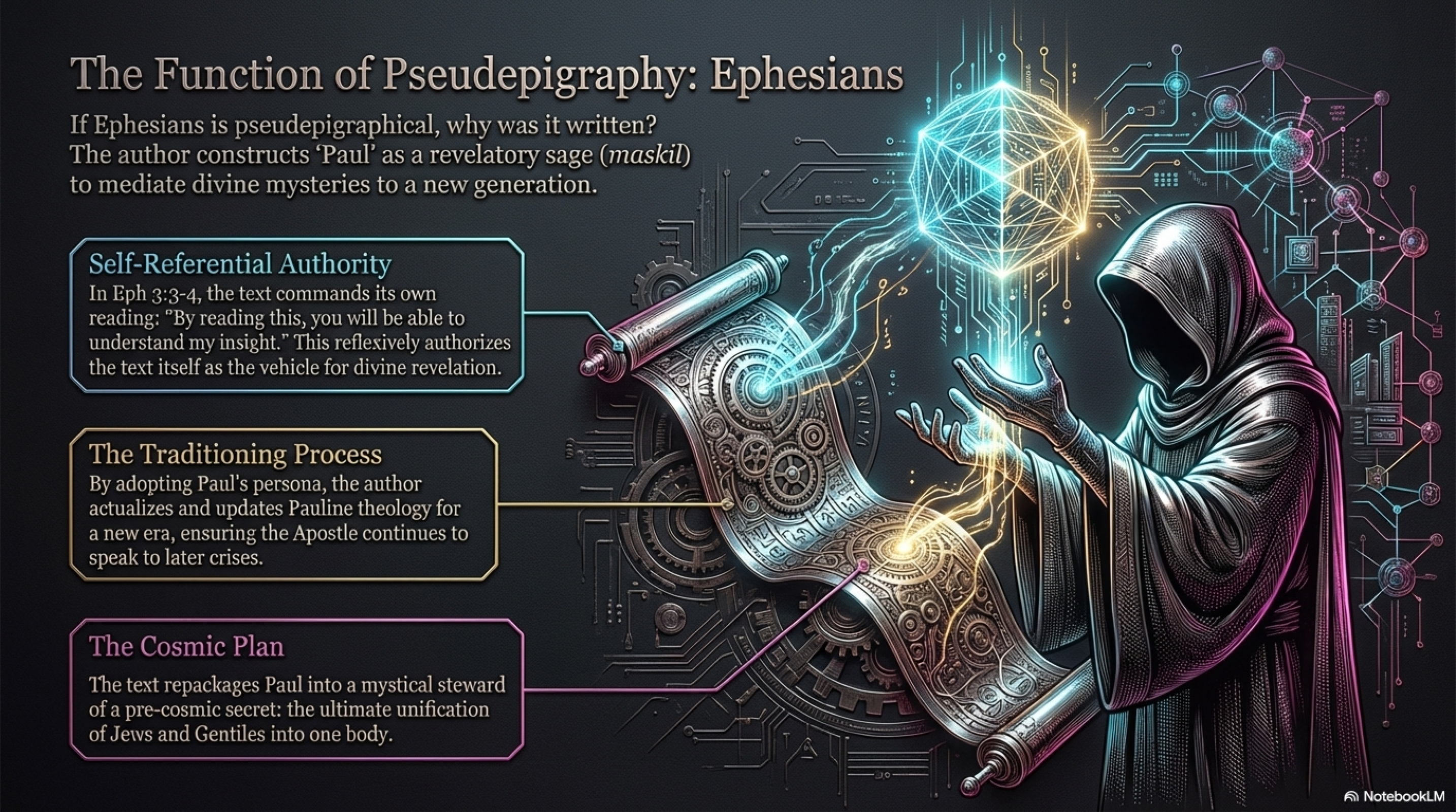 To bypass community detection, anonymous authors deployed advanced “rhetorical engineering”. The Letter to the Ephesians serves as a primary case study. In Chapter 3, the text breaks its pastoral flow for an autobiographical digression regarding the author’s divine commission.